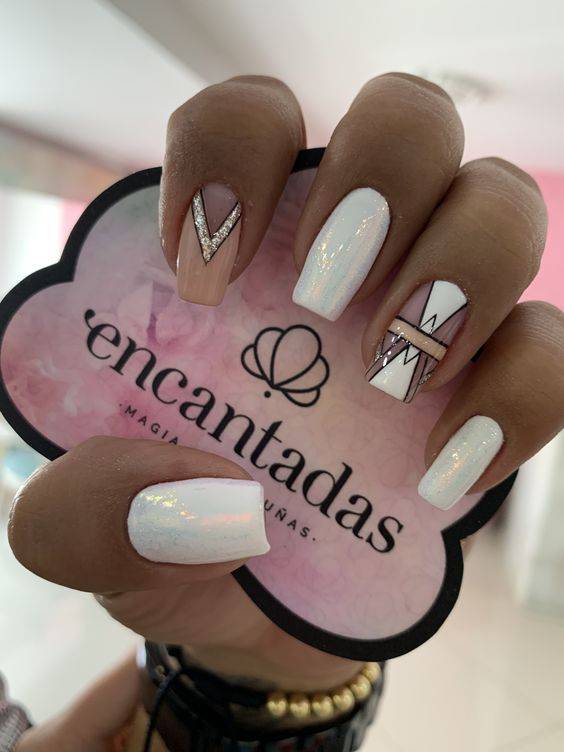 Хаки не самый актуальный так как не является базовым, поэтому нечасто используется в маникюре. Дополнительный цвет лучше смотрится в выделяющихся оттенках. Стразы на матовом топе или геометрия приемлемые варианты в маникюре на сегодняшний день.