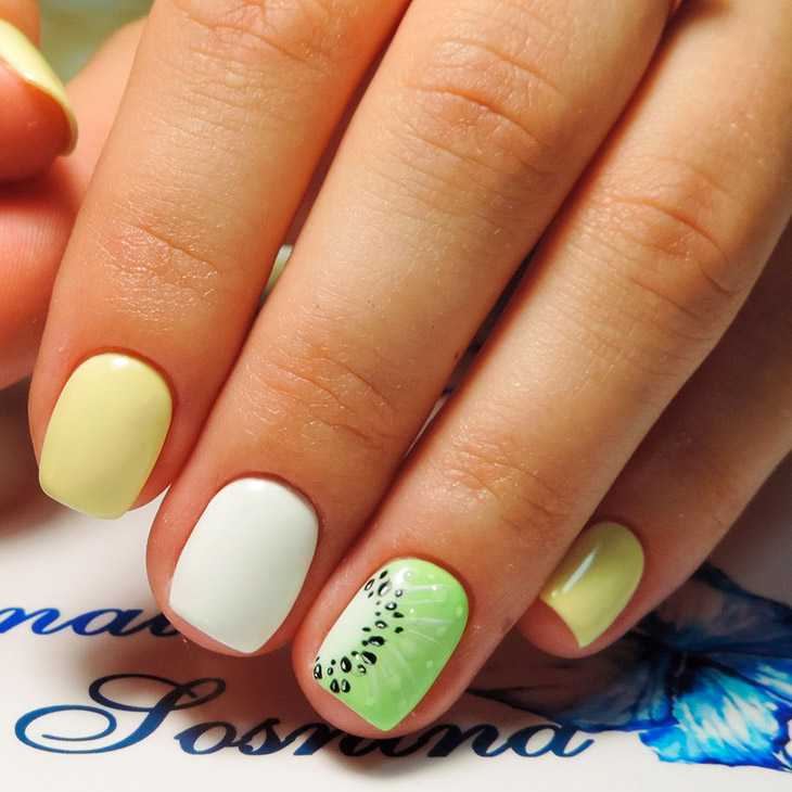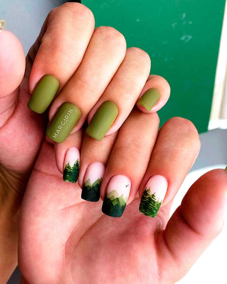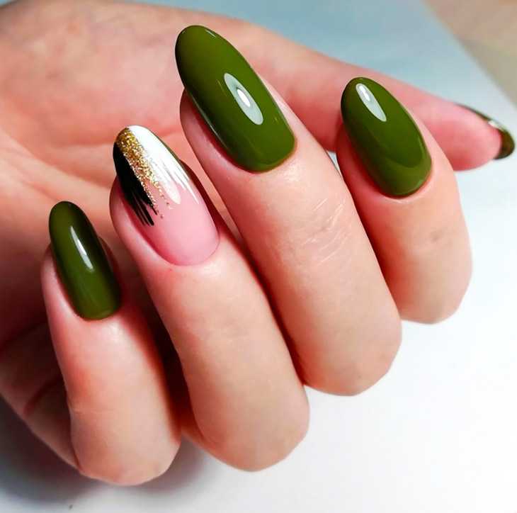Оливковый – оригинальный цвет, сочетается с анималистическим дизайном, с повседневной одеждой. Может быть акцентом или дополнением в другом виде маникюра.