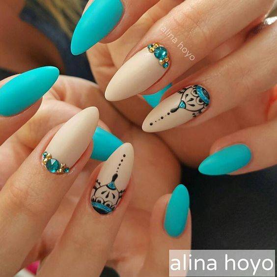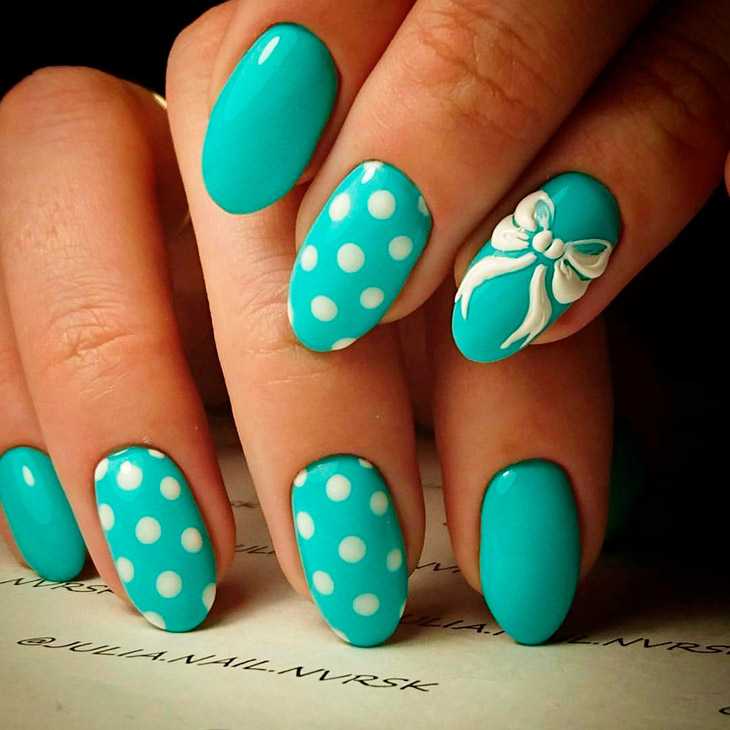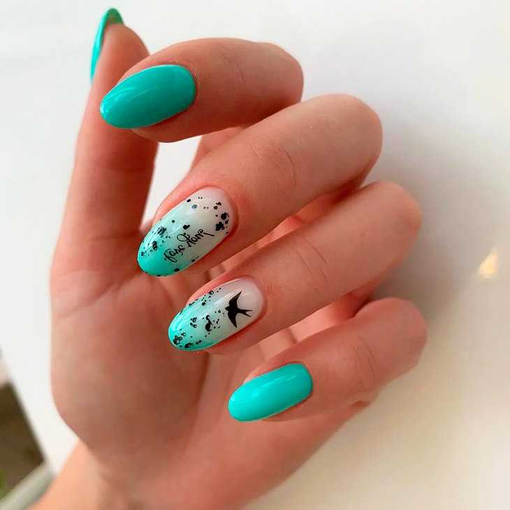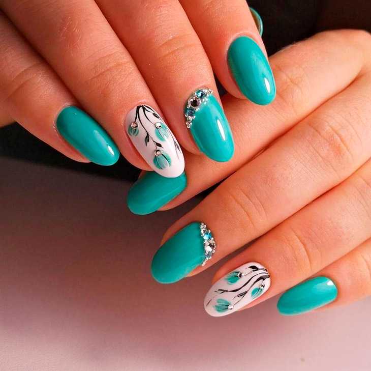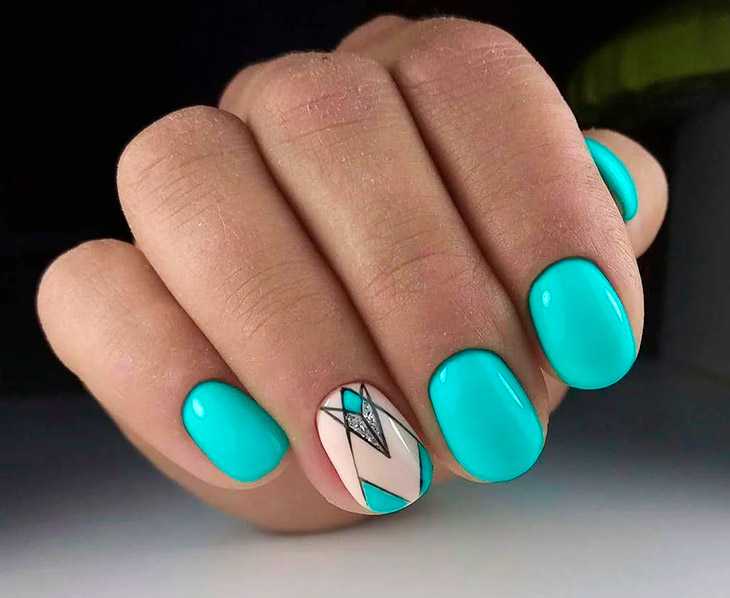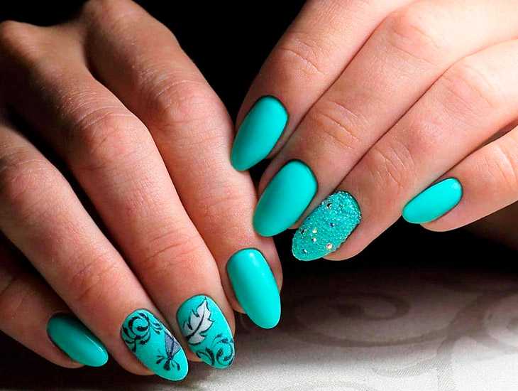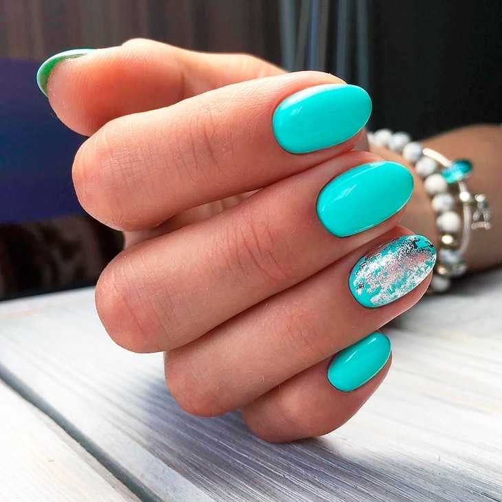 На сегодняшний день, бирюзовый цвет приобрёл популярность не только в маникюре. Он самый сдержанный и одновременно яркий. Сочетается с нежными обликами и украшениями.
