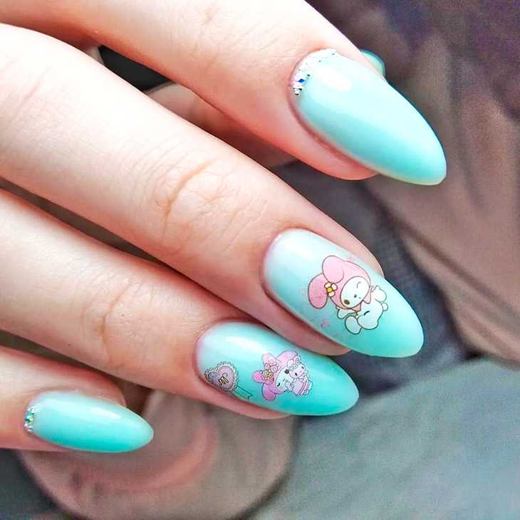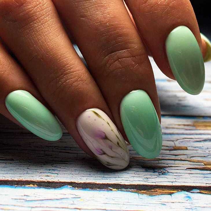 Мятный маникюр бросается в глаза, гибкий к колористике одежды. Чтобы удлинить ногти, подойдёт глянцевый топ.