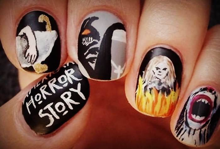 - тема ужасов — в этом случае надо проявить фантазию, использовать фото и создать дизайн «история ужасов». Это не повседневный маникюр — отлично подойдет для Хэллоуина или маскарадной вечеринки.