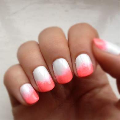 - Двуцветный декоративный дизайн. В отличие от предыдущего варианта, второй слой лака необходимо нанести таким образом, чтобы он немного захватил окрашенную лаком другого цвета часть. Таким образом, середина ноготка окажется выпуклой, поскольку ее смогут захватить два лаковых слоя.