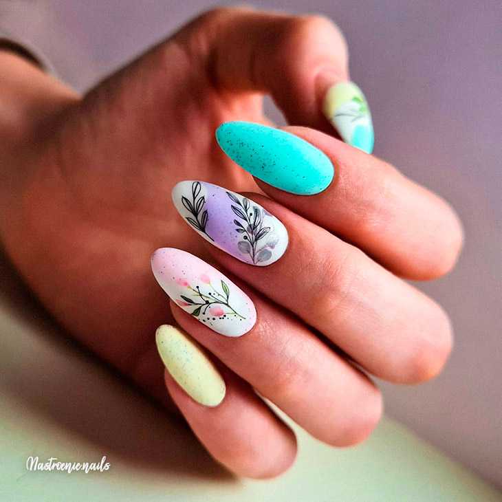 Лунный маникюр – напоминает французский вариант, однако вместо «улыбки» выделяется лунка у основания ногтевой пластины. Элемент выводится при помощи специального трафарета цветом, контрастирующим с оттенком оставшейся части ногтя. Negative space или голый маникюр. На ноготь наносится основа прозрачного цвета, на которой затем с помощью трафаретов или наклеек рисуют всевозможный декор. Главная особенность – «голого» места на ногте должно быть больше, чем украшенного. Чтобы покрытие не казалось скучным, применяют яркие оттенки и замысловатые формы. «Ночное небо» или блестящий маникюр. На ногтях создается эффект мерцающего звездного неба за счет нанесения на них блесток, глиттера, шиммера, сияющих минералов, слюды. Выполняется в синих, фиолетовых, голубых оттенках. Омбре (градиент) – расположение на ногте сразу нескольких цветов, плавно переходящих друг в друга. Оттенки могут быть близкими или контрастирующими, главное – размытый переход между ними. Градиент может заливаться как в вертикальном, так и в горизонтальном направлении или по диагонали. Glass nails или «разбитое стекло». С помощью кусочков фольги и голографической пленки мастер создает на однотонном ногте узор, напоминающий осколки стекла. Частицы могут располагаться как в хаотичном порядке, так и выстраивается в конкретный элемент в виде мозаичного витража, например. Nude – ногти любой длины и формы покрываются лаком пастельного оттенка, максимально приближенного к цвету кожи. При этом они не обязательно должны быть однотонными, на них может присутствовать градиент, нежные тонкие рисунки и различные декоративные элементы. Художественный, китайский маникюр. При таком способе украшения каждая ногтевая пластина расписывается отдельно индивидуальным дизайном, как правило, связанным с цветами и растениями. Мастер должен обладать высокими художественными навыками, знать, как ведет себя кисть на том или ином покрытии. Рисунок смотрится удачно только на длинных ногтях.