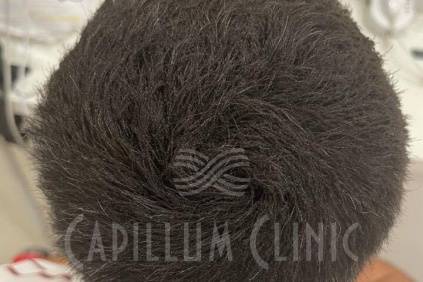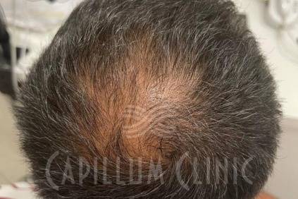 Постепенное поредение волос у пациента 52 лет вследствие андрогенетической алопеции. В течение 12 месяцев терапии ежедневно применялись шампунь и лосьон для роста волос Capillum Clinic. Подробнее