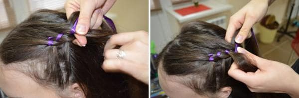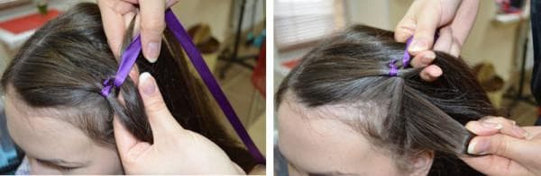 - Волосы разделяются на три части, к центральной пряди привязывается лента подходящего цвета.