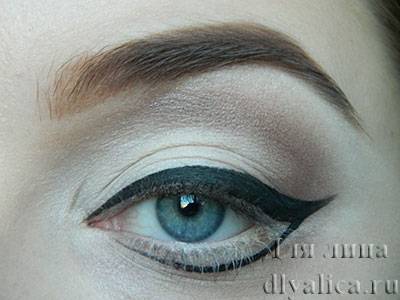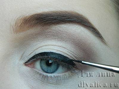 Чёрной подводкой выводим стрелку из нижнего изгиба хвостика стрелки. Ведём линию, которая повторяет изгиб нижнего века. Завершаем эту линию тонким концом у внутреннего уголка.