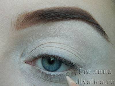 На нижнее веко наносится белый карандаш — это для дополнительного эффекта увеличения. При помощи жидкой подводки следует еще раз пройтись по нарисованной линии, но потом завести за внешний угол глаза и нижнюю рисовать ниже слизистой. Таким образом, вы рисуете новую границу. Завершающий штрих — это нанесение темных теней на складку между подвижным и неподвижным веком.