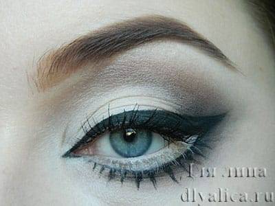 3. Черным цветом рисовали брови и глаза. На месте надбровных дуг проводили длинные черные линии, а столь известные стрелки наносили поверх красного полукруга на внешнем веке.