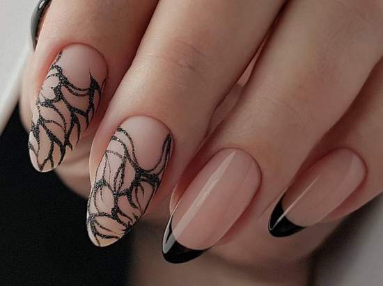 Во французском маникюре можно выделить самый кончик ноготка или одним цветом, или же полноценным рисунком. Рисунки могут быть разнообразные, как ажурные, так и более спокойные, и нежные. Наиболее популярными рисунками в таком маникюре являются: кружевные и ажурные рисунки, цветочный узор, «природная текстура», геометрия и абстракция.