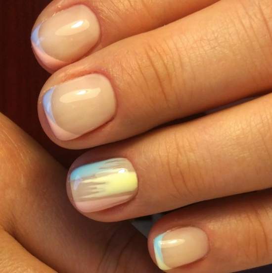«Френч наоборот» — так его по-другому называют — уникален тем, что здесь нет ограничений в цвете. Можно выбрать самые невероятные оттенки, но так, чтобы они гармонировали друг с другом.