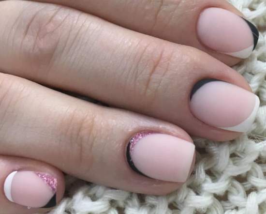 Изначально классический французский дизайн выполняется в нейтральных цветах, например, белым и телесным. На сегодняшний день можно сочетать несочетаемые на первый взгляд тона. И от этого маникюр выглядит только лучше и оригинальней. В дизайне «наоборот» выделяется нижняя часть ногтя – основание. Такой френч идеально смотрится на длинных ногтях, так как подобный нейл-арт зрительно уменьшает размеры.