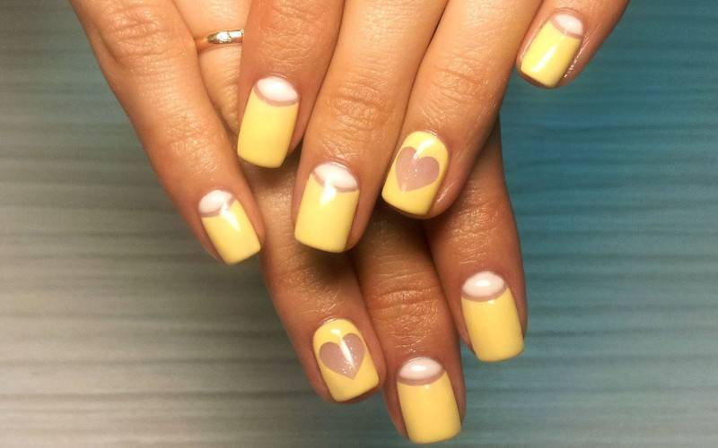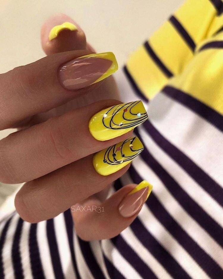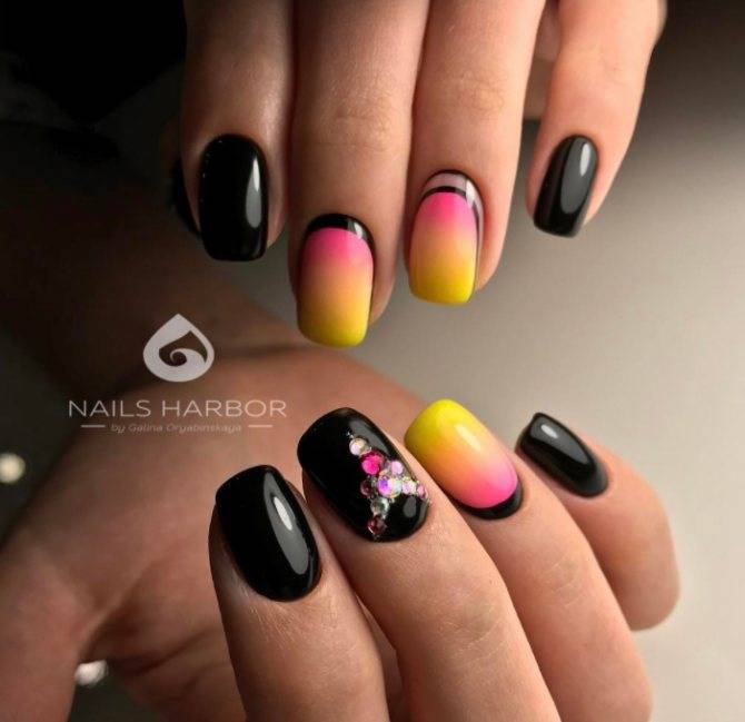 - Возьмите тонкую кисть или дотс. Края и лунку черных ногтей закрасьте желтым цветом. А френч «наоборот» двух других пальцев сделайте черным тоном.