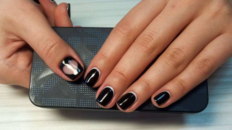 Обратный френч гель-лаком встречается чаще всего, на фото такой маникюр выглядит более насыщенным и стойким. В домашних условиях можно воспользоваться обычными лаками.