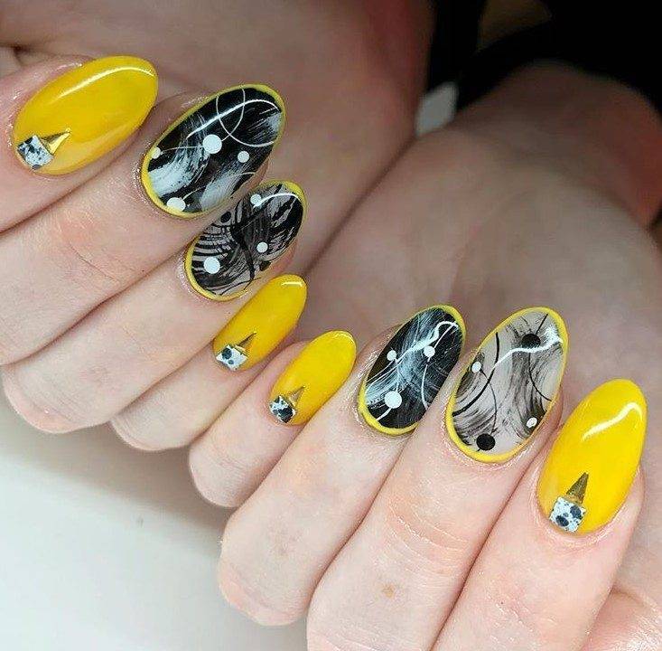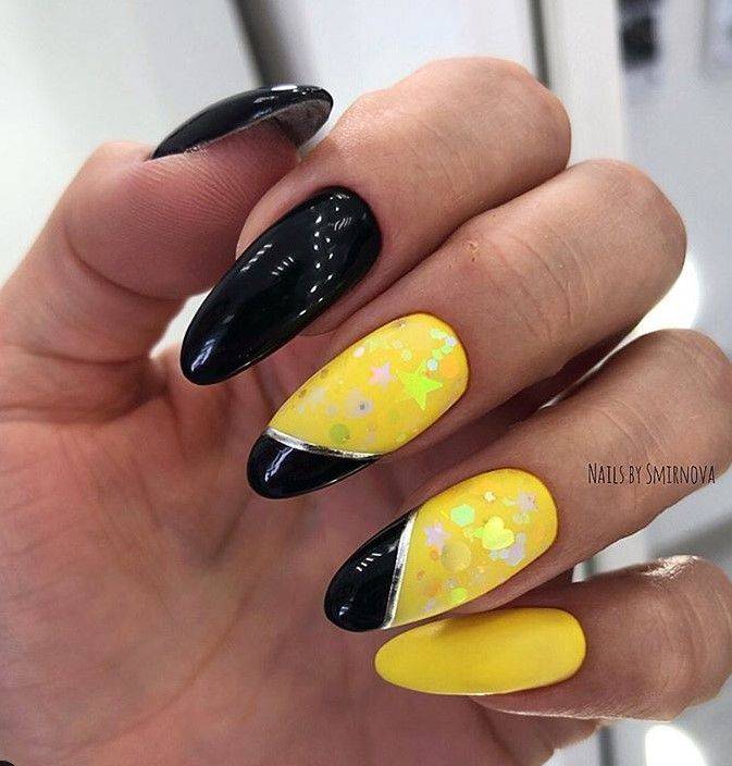 - Средний и безымянный палец покрасьте в желтый цвет. Остальные ногти сделайте черным оттенком.