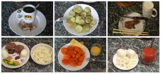 | 3 день | Натуральный несладкий кофе, 1 ломтик подсушенного хлеба | 1 большой кабачок или баклажан, обжаренный в растительном масле. Размер порции не ограничен | 2 крутых яйца, 200 г отварной говядины без соли; салат из сырой капусты с подсолнечным маслом |