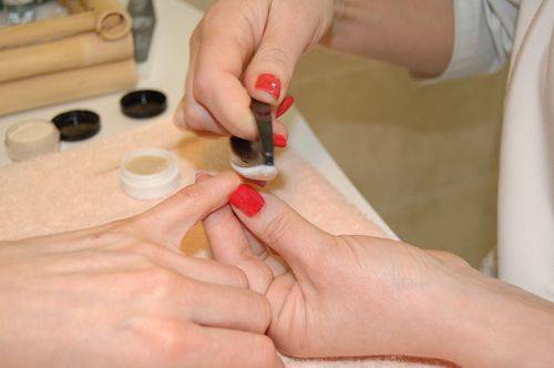 Под конец ногтевую пластину покрывают одной из лечебных сывороток или маслом, а затем завершают маникюр массажем с помощью разогретых мешочков ацуи.
