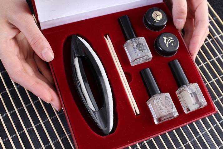 Этот тип маникюра по-японски существует четыре столетия. Благодаря инновациям, эта техника добилась значительных успехов, результаты стали намного лучше. Купленным набором можно пользоваться более года, только пройдя специальное обучение. Те, кому требуется срочный уход, могут воспользоваться экспресс косметичкой, которая стоит значительно дороже упомянутых выше средств. Комплекс состоит из основных и дополнительных составов и не требует долгих выборов гелей, декора.