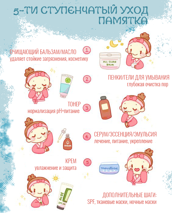 А кто дочитал аж до этого места, тому памятка 5-ти ступенчатого корейского ухода. А если не можете сохранить себе эту картинку, поставьте + в коментраиях и я вам вышлю ее на почту.
