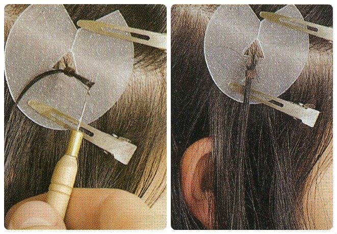 Выполнение наращивания волос по описываемой технологии достаточно простая процедура, но при этом очень кропотливая. На голове делается горизонтальный пробор. На нем с интервалом 3-5 миллиметров на пряди «родных» волос надеваются клипсы, в это же кольцо с помощью специализированного крючочка продевается искусственная прядь волос.