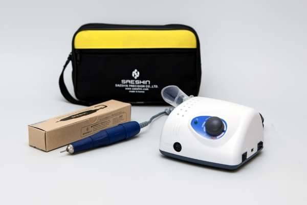 Другая модель от марки Saeshin имеет схожие характеристики, однако в ней установлен чуть более мощный двигатель на 65 Вт, который способен выдавать до 35 000 оборотов в минуту. Ножная педаль в этом аппарате не предусмотрена, изменение параметров работы происходит за счет установленного на док-станции переключателя. Переключатель относится к бесступенчатому типу, что позволяет изменять скорость максимально плавно.