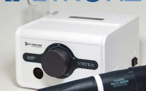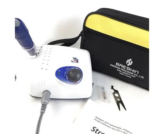 Модель STRONG 210 имеет более современный внешний вид, смену направления движения (реверс), набор из 18 фрез, высокую мощность насадки (64 Вт), удобное в управлении устройство, плавную регулировку скорости с усилием вращения до до 35 тыс об/мин. В комплект входят педаль пуска и остановки, ручка с микромотором и подставка для него.