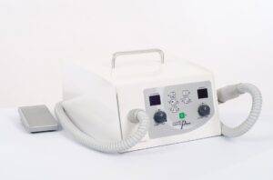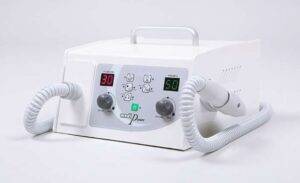В комплект входит педаль для запуска и остановки устройства, набор фрез в пенале и подставка для наконечника. При мощности 64 Вт скорость вращения достигает 37 тысяч оборотов в минуту.