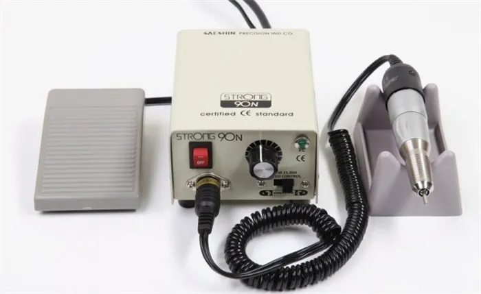 Он легко справляется со всеми поставленными перед ним задачами. Агрегат Strong 90N/102 относится к классическим моделям. Доступный с педалью или без нее, он пользуется популярностью среди мастеров педикюра и маникюра. Модель оснащена плавной регулировкой скорости вращения до 35 тысяч оборотов в минуту, переключателем реверса и мощностью 64 Вт.