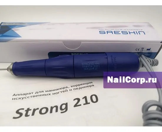Strong 210 — одна из самых популярных моделей. Мощный 64-ваттный мотор позволяет легко выполнять маникюр, выпрямление ногтей и педикюр. Реверсивная функция (вращается в обоих направлениях). Носовая опора защелкивается в корпусе и имеет 14 отверстий для резки. Может быть оснащен ножной педалью для включения/выключения вращения и кнопкой на задней панели для переключения с ручного на ножное управление. Длина кабеля составляет 1,7 м. Блок управления поставляется с тремя микромоторными рукоятками (рукоятками для управления), выбор рукоятки определяет конечную производительность блока.