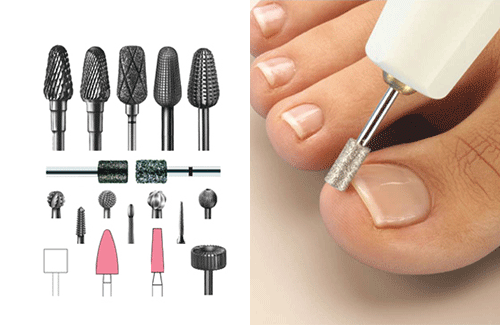 В зависимости от зоны применения, различают цилиндрические, конические, шарообразные и другие виды фрез. Так, остроконечная фреза применяется для обработки труднодоступных участков – ногтевых желобков. Цилиндрическая фреза характерна тем, что на её поверхности есть специальные насечки с напылением. Благодаря плоскому торцу этой фрезы, ею можно обрабатывать края трещин, кратер стержневой мозоли, натоптыши и другие проблемные участки.