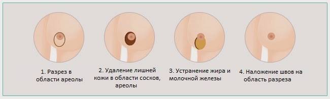 Уменьшение ареол сосков. Хирург иссекает избыток кожи по краю околососкового кружка, формирует границы новой ареолы, затем накладывает внутренний и внешний (косметический) швы. Окружность ареолы может быть сокращена на 3-4 см.