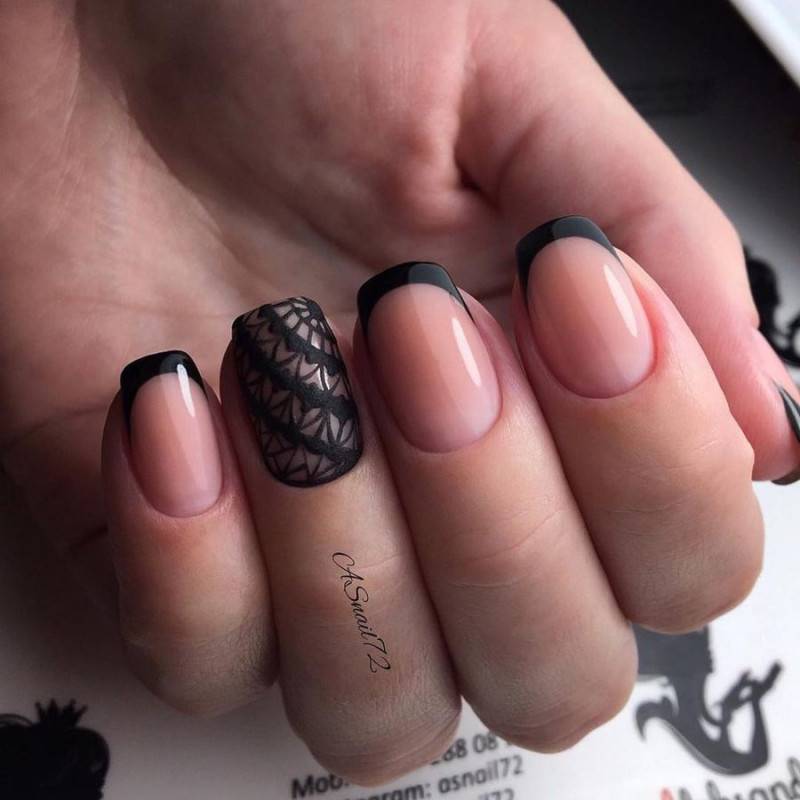 Неординарно будет смотреться черный френч с блестками по контуру улыбки. Такой маникюр может быть исполнен с яркой или нейтральной базой. Прорисовывается улыбка косой конфигурации или внахлест.