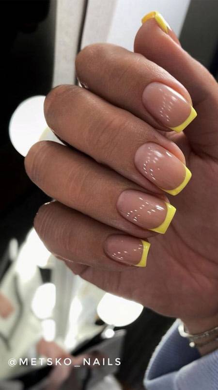 Эти красочные желтые кончики ногтей в французском маникюре наверняка вызовут улыбку на вашем лице. Желтый цвет отлично сочетается с нюдовой основой, что делает его идеальным цветом для модного французского маникюра сезона 2022.