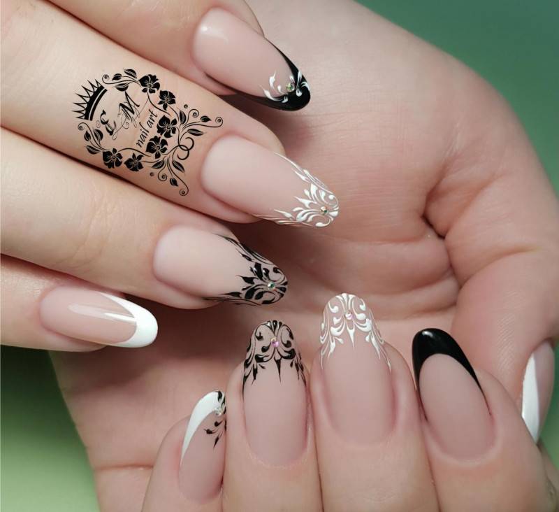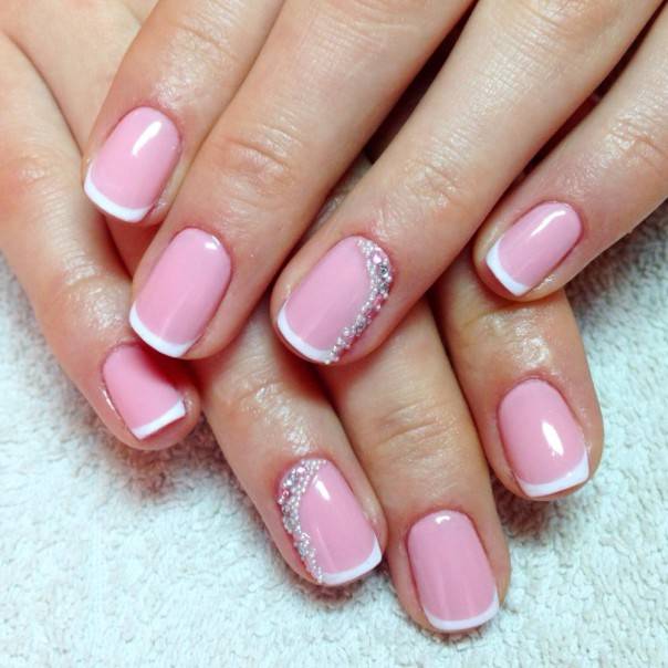 Классические бело-розовые тона по-прежнему в моде. Основную конкуренцию им составляют нейл-арты в белом, черном, бордовом цвете. Все эти цвета и многочисленные их полутона великолепно сочетаются как со стразами, так и с блестками.