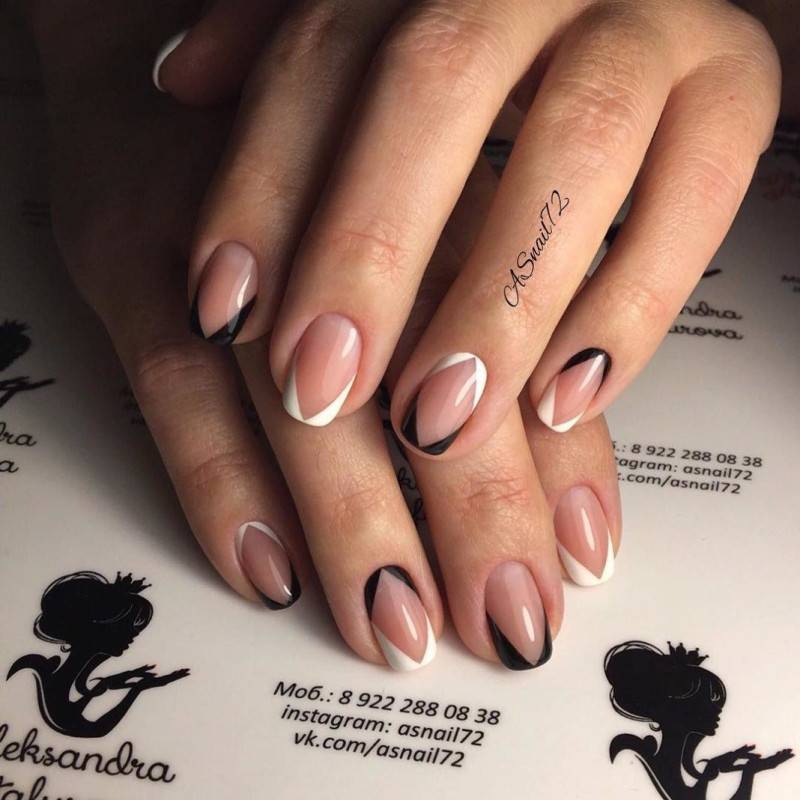 Сочетание техник французского и лунного маникюра также является трендом в 2019 году. Дизайн острых ногтей, выполненный в таком стиле, придает маникюру изысканный и эффектный вид. Главной особенностью этой техники является наличие двух улыбок, одна рисуется на кончике ногтя, а другая у его основания. Сочетание обычного с обратным френчем выполняется в пастельных тонах, для смелых особ стилисты предлагают выбрать дерзкие оттенки: фиалковый, черный, ядовито-салатовый, жгуче-оранжевый, пепельный.