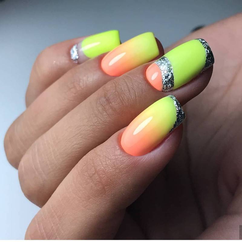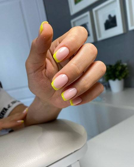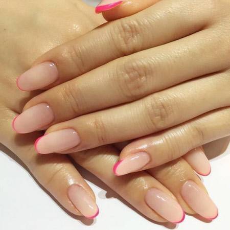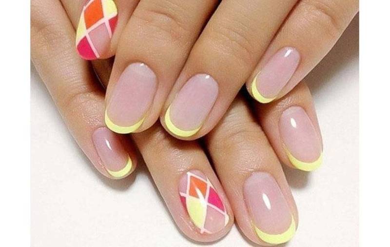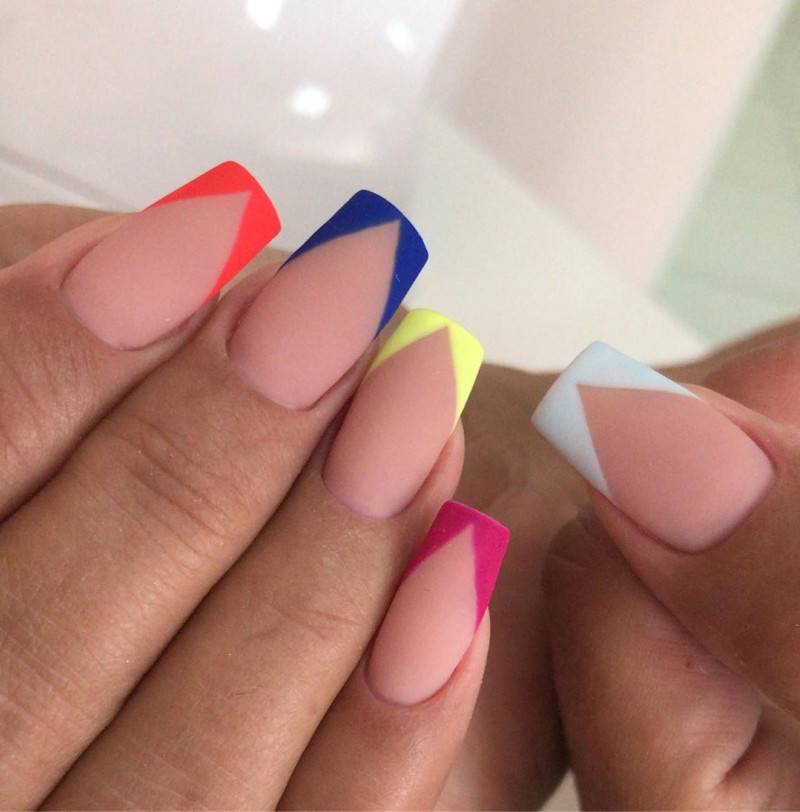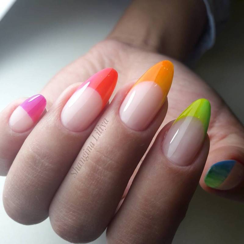 Достаточно заменить белую полоску на кончиках на яркую расцветку. Неоновая каемка желтого, синего, красного и розового цвета отлично будет сочетаться с пастельными тонами. При создании композиции можно использовать одновременно несколько типов лака: яркий, блестящий и нежный нюдовый цвет.
