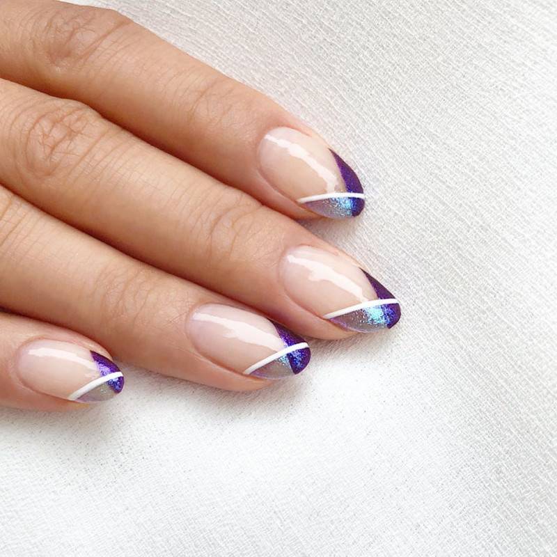 Актуален маникюр, когда блестки расположены плотным слоем по линии френча, а ноготок безымянного пальца покрывается полностью. В тренде оттенки шиммера – золотой, жемчужный, фиолетовый, медный, разноцветный.