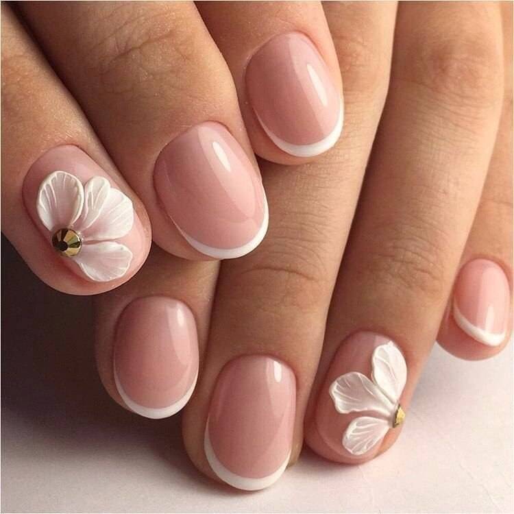 - Короткие ногти. На коротких ногтях уместен лаконичный френч с молочной полоской, по сути, удлиняющей ногтевую пластину. Избегайте обилия рисунков, ажурных декоративных элементов и страз.