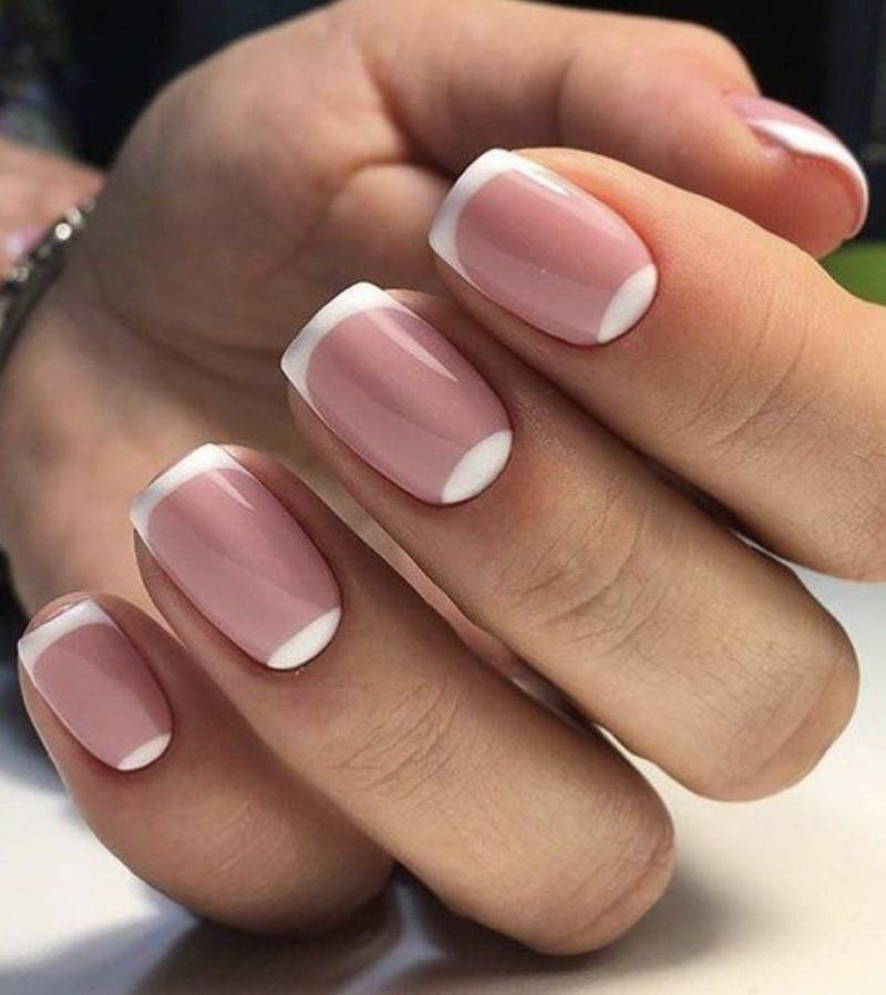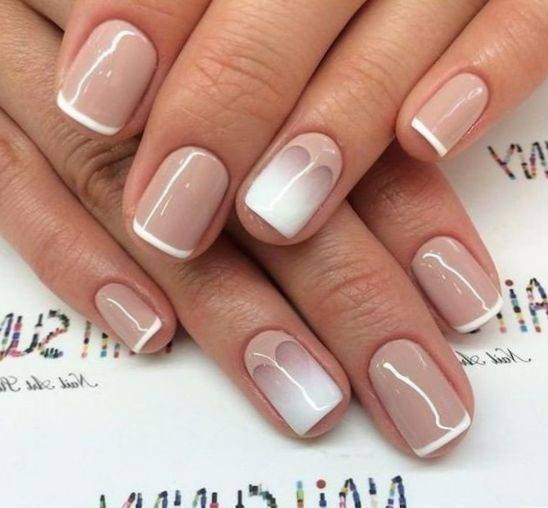 Самый нежный французский маникюр получается при использовании классической комбинации оттенков – белого с телесным или светло-розовым. Стильные белые кончики придадут ногтевым пластинам изящность и привлекательность.
