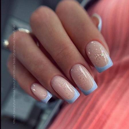 Нежные, женственные оттенки голубого лака потрясающе смотрятся в французском маникюре. Голубая линия улыбки прекрасно дополнит все ваши летние образы.