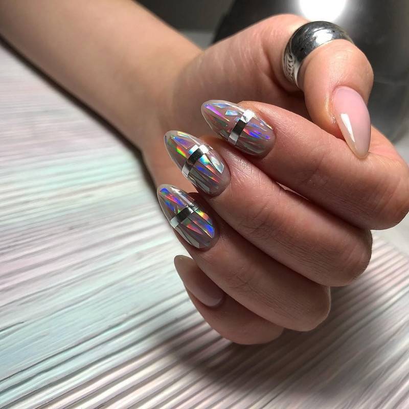 В сезоне 2019 года рекомендуется оформлять французский маникюр и втиркой. Френч, покрытый голографической пудрой, придаст облику гламурный вид и заставит окружающих обратить восхищенный взор на ваши руки.