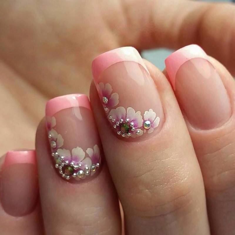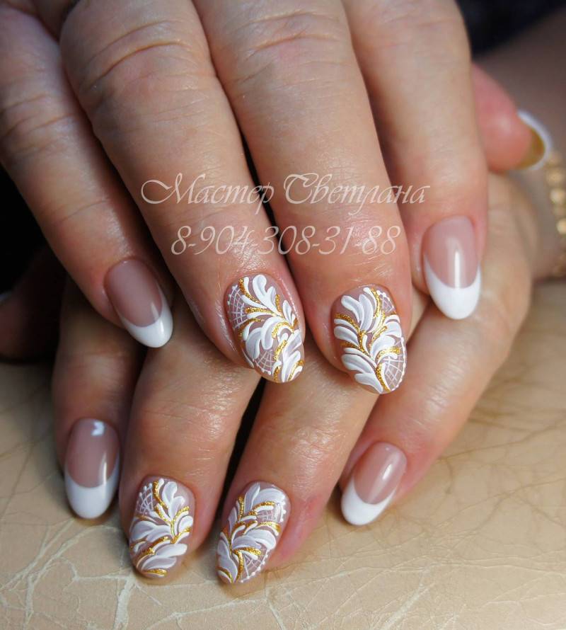 - Так же элегантно и нежно смотрится французский маникюр, который обрамлен по контуру улыбки витиеватыми вензелями. Дополнением станет инструктированный стразами безымянный ноготь. Кстати, композицию с переливающимися камушками можно сделать, взяв их разного размера, но с различной цветовой палитрой.