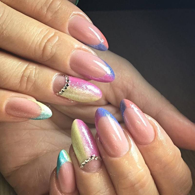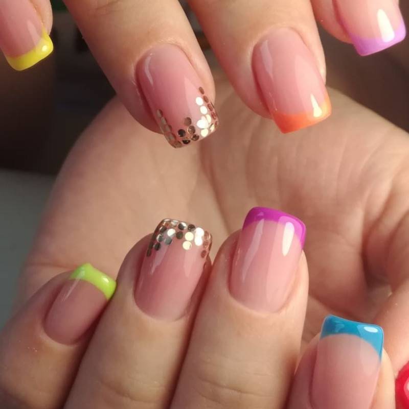 Разноцветный френч всегда выглядит аккуратно и стильно. В зависимости от выбранных оттенков можно использовать технику омбре, добавить в дизайн блестки или стразы, выполнить твист-френч.