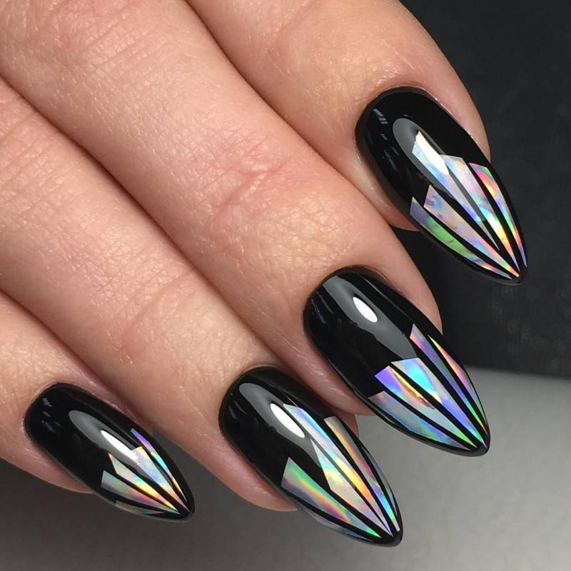 Мода на все сияющее и блестящее была в далеких 1990 годах, и спустя время стразы и бульонки отошли на второе место, а на смену пришли строгие однотонные покрытия. И теперь, спустя годы, вновь в тренде маникюр на острые ногти в обрамлении шиммера и глиттера.