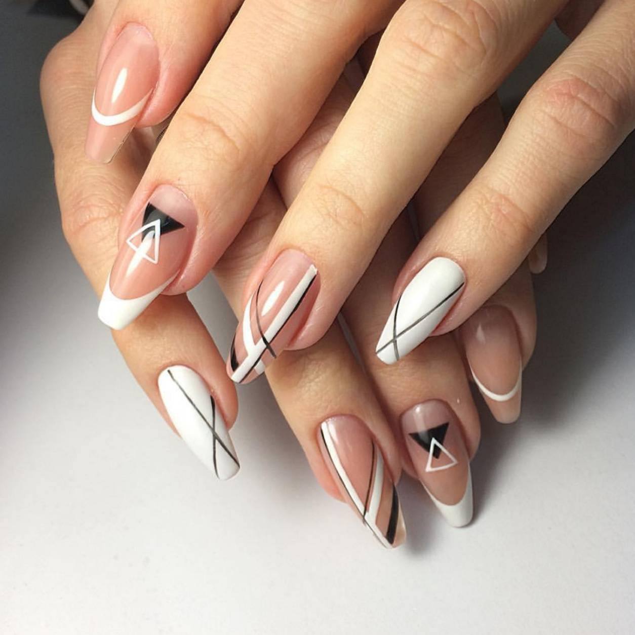 Маникюр с рисунком всегда выглядит стильно и привлекает внимание. Геометрия – удачная тематика для декора