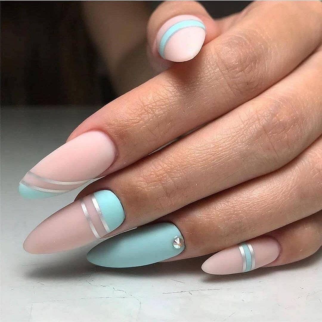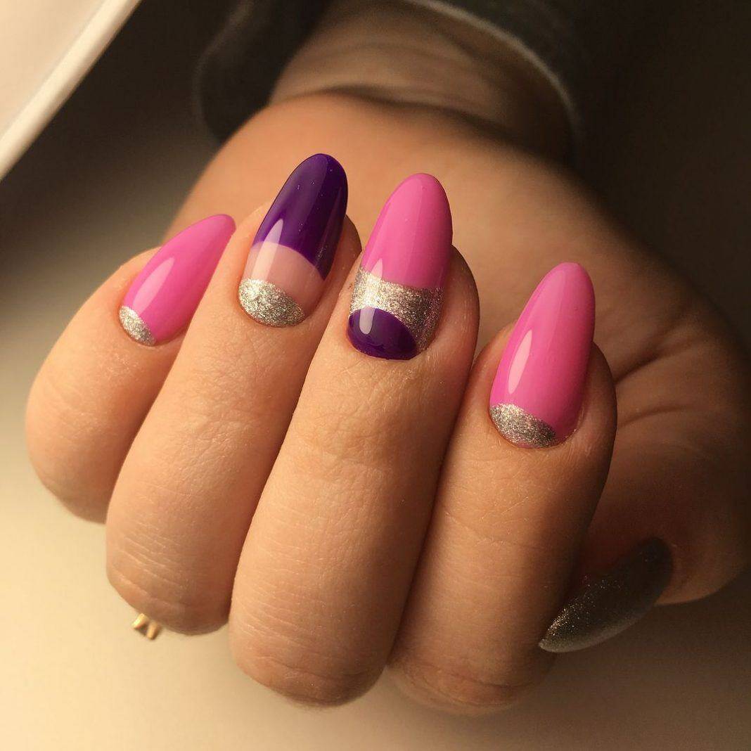 Сочетание техник французского и лунного маникюра также является трендом в 2019 году. Дизайн острых ногтей, выполненный в таком стиле, придает маникюру изысканный и эффектный вид. Главной особенностью этой техники является наличие двух улыбок, одна рисуется на кончике ногтя, а другая у его основания. Сочетание обычного с обратным френчем выполняется в пастельных тонах, для смелых особ стилисты предлагают выбрать дерзкие оттенки: фиалковый, черный, ядовито-салатовый, жгуче-оранжевый, пепельный.