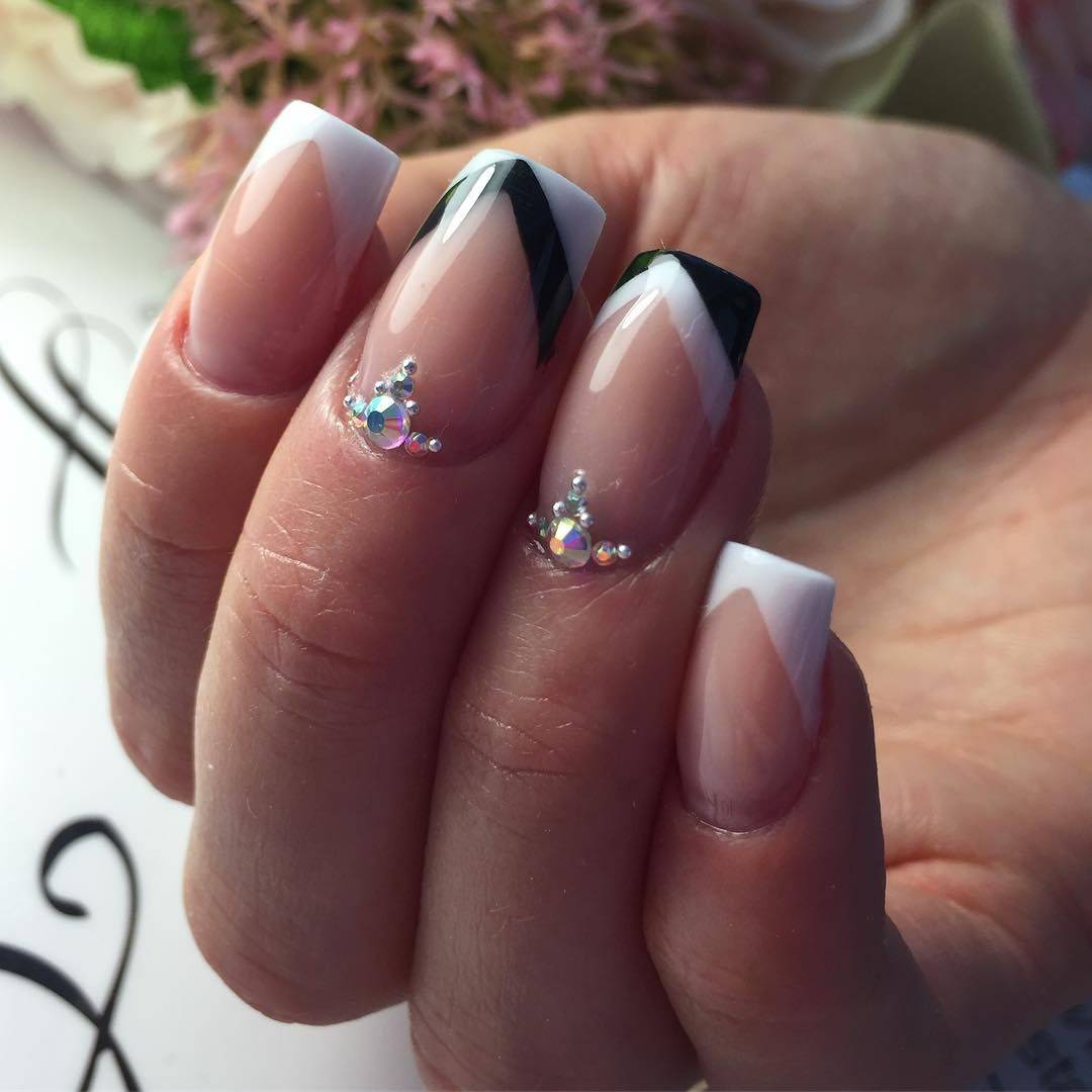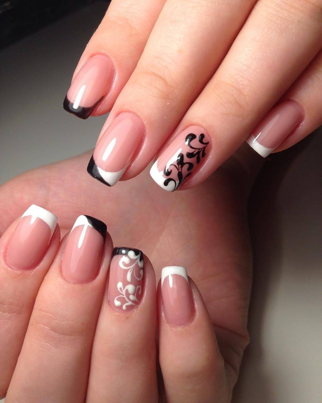 Классические бело-розовые тона по-прежнему в моде. Основную конкуренцию им составляют нейл-арты в белом, черном, бордовом цвете. Все эти цвета и многочисленные их полутона великолепно сочетаются как со стразами, так и с блестками.