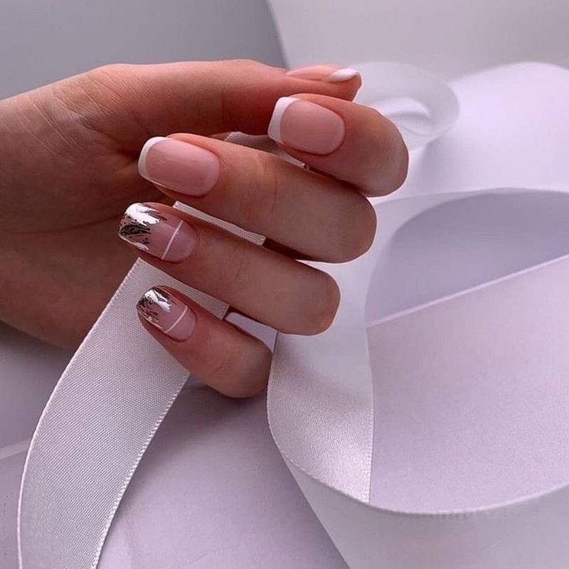 - Короткие ногти. На коротких ногтях уместен лаконичный френч с молочной полоской, по сути, удлиняющей ногтевую пластину. Избегайте обилия рисунков, ажурных декоративных элементов и страз.