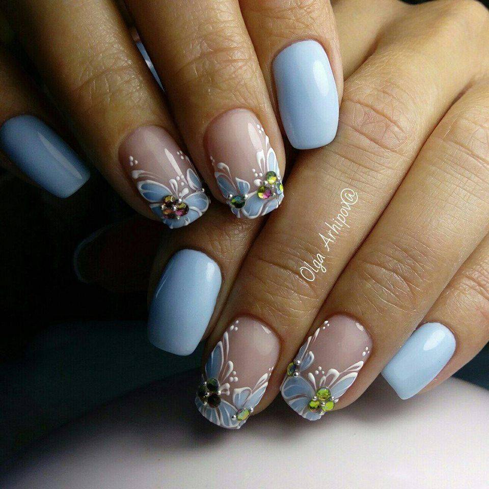 Нежные, женственные оттенки голубого лака потрясающе смотрятся в французском маникюре. Голубая линия улыбки прекрасно дополнит все ваши летние образы.