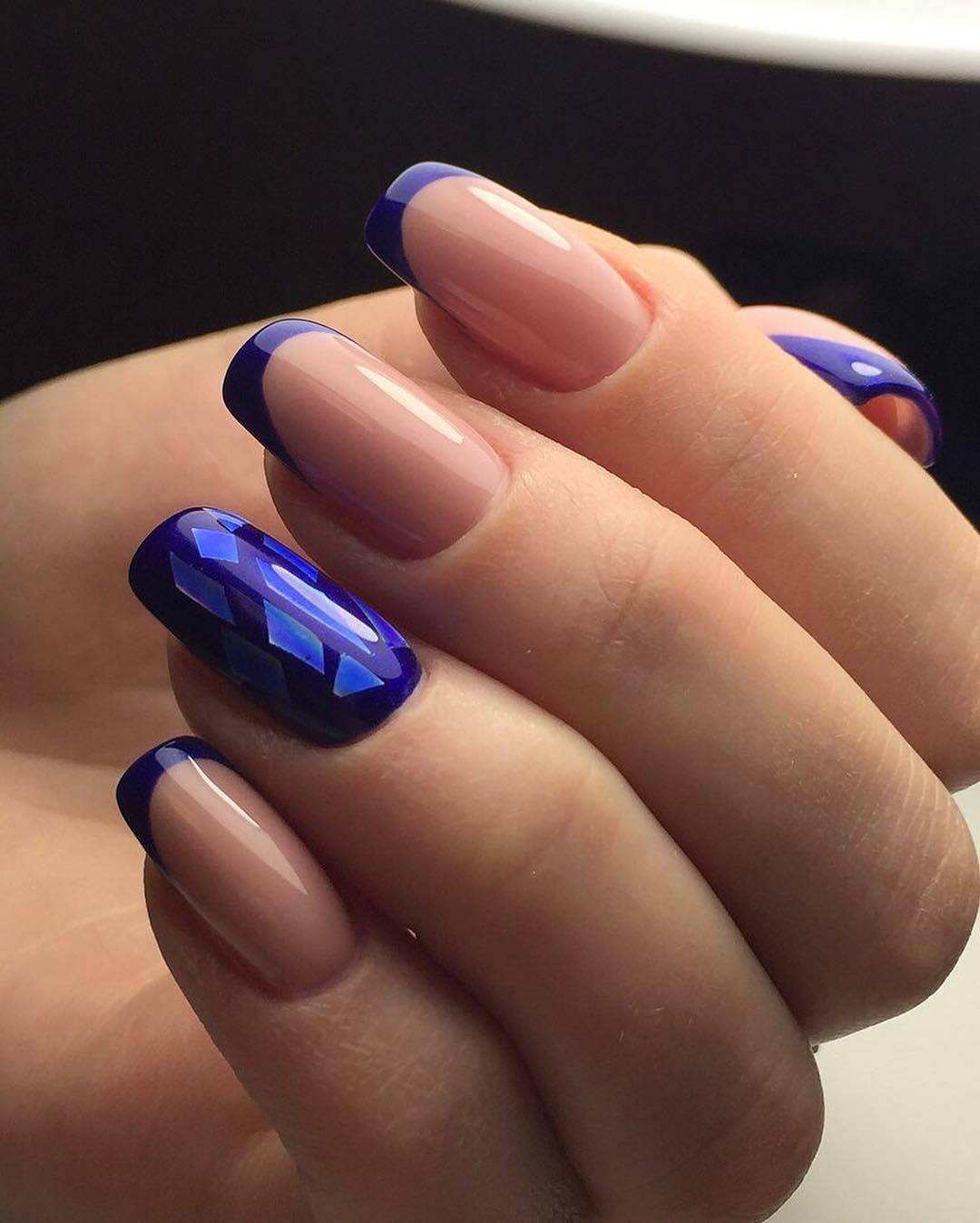 Синий цвет вызывает спокойствие и умиротворение, в французском маникюре этот цвет выглядит потрясающе. Синий френч также можно разбавить разными элементами дизайна в этом сезоне.