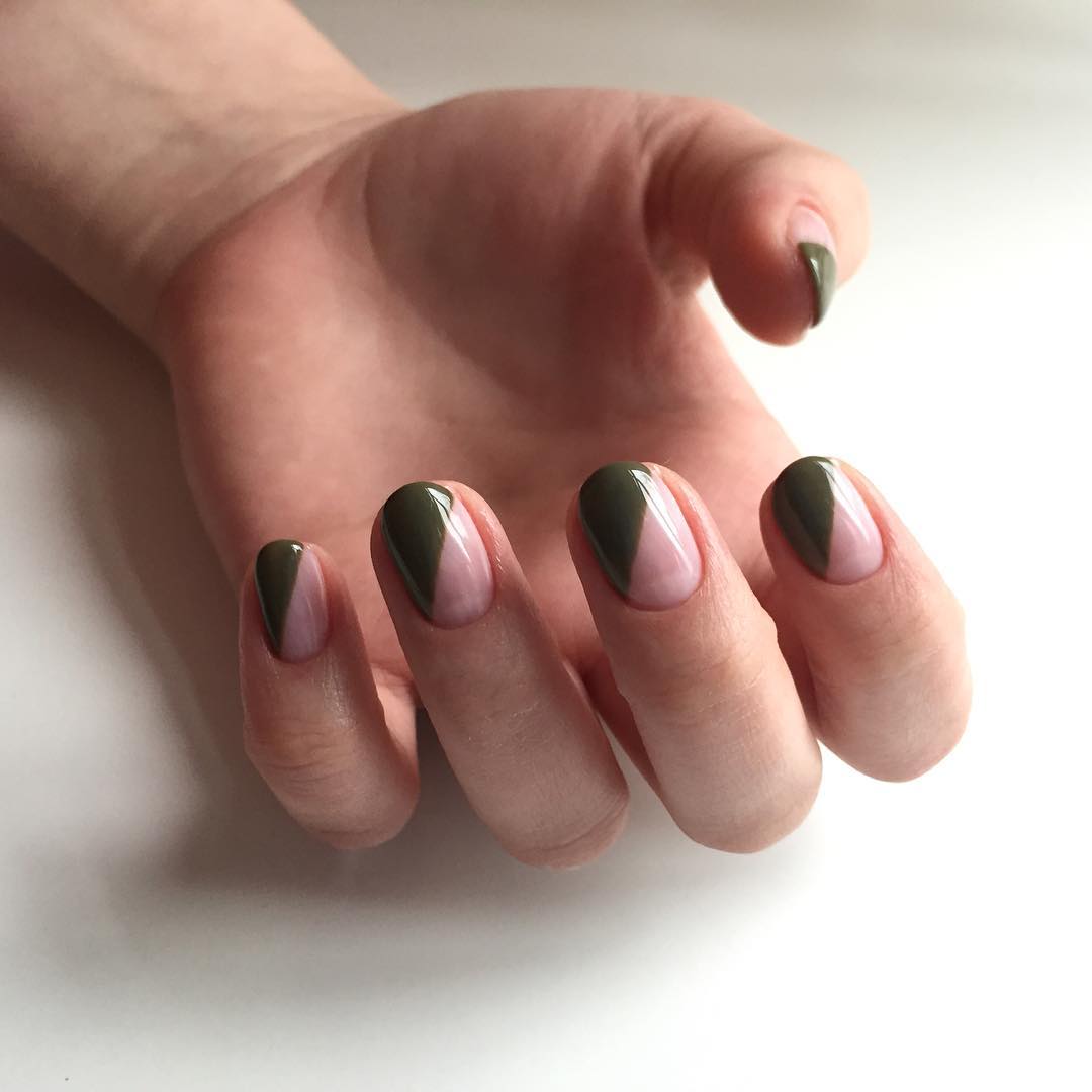 - геометрия – используйте вместо плавной прорисовки края ногтя треугольные формы. Они отлично смотрятся на квадратных и скругленных ноготках. На квадратных ноготках великолепно выглядит твист-маникюр, о котором подробнее речь пойдет ниже.